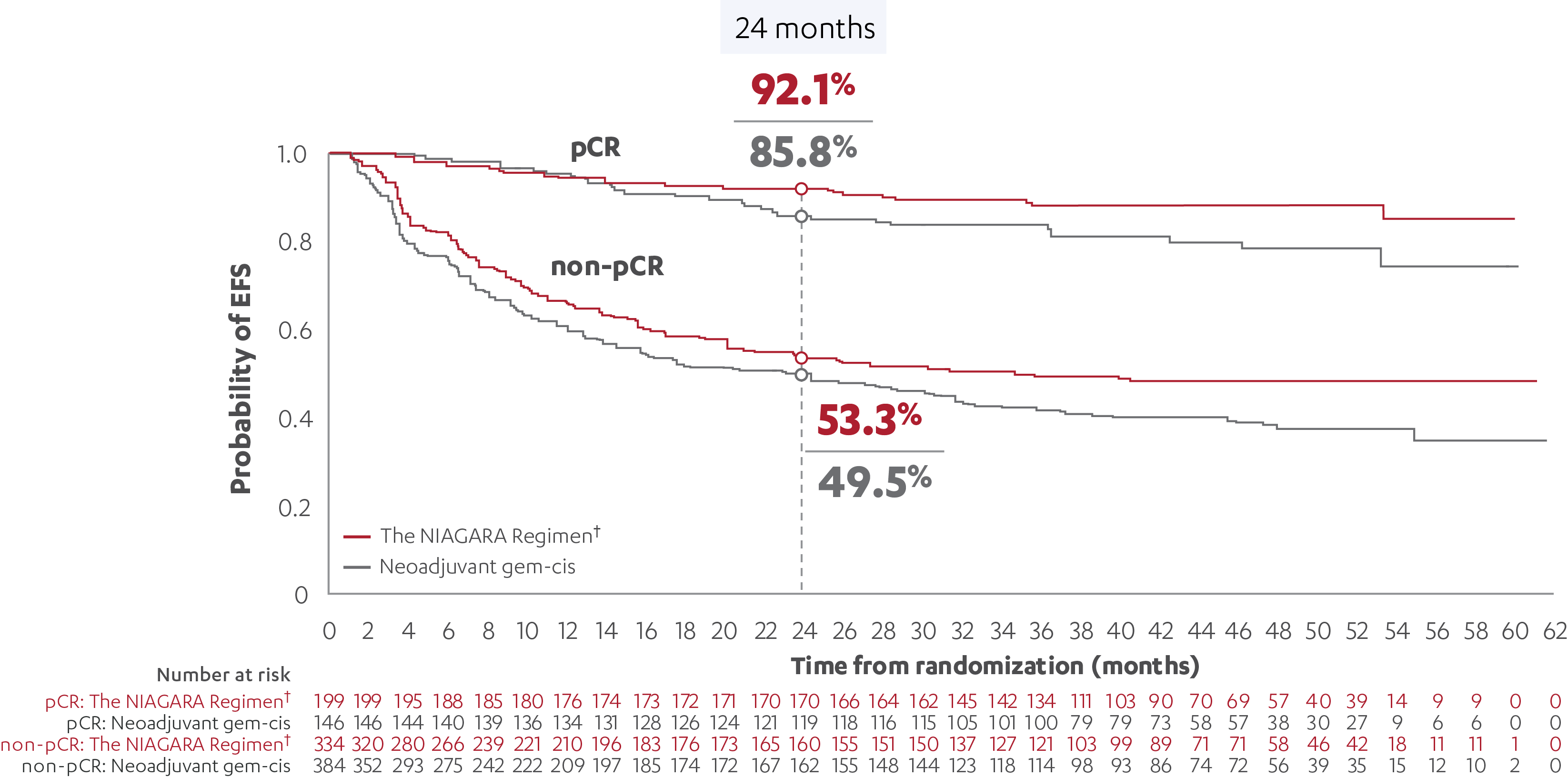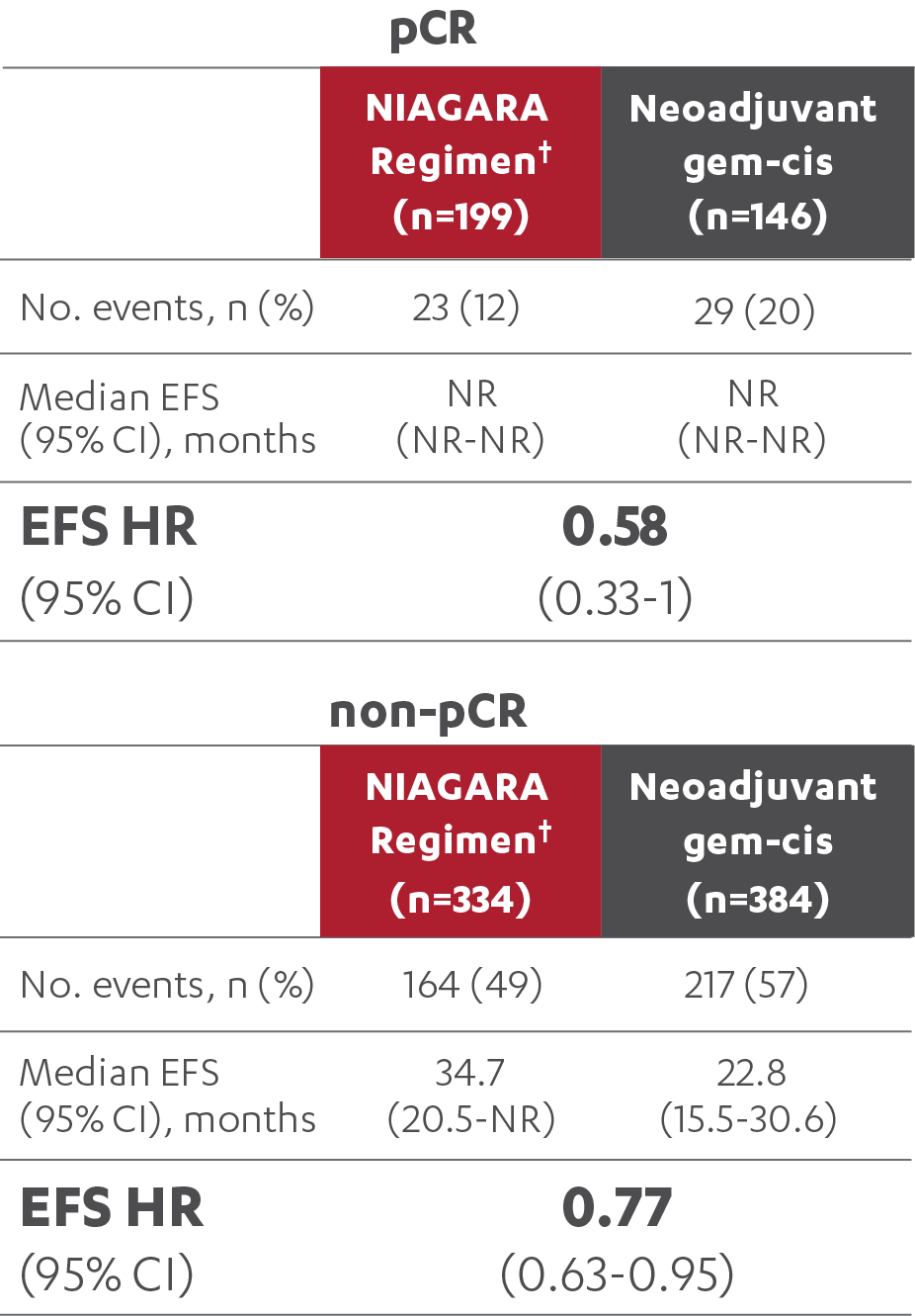 Median EFS was not reached with the NIAGARA Regimen‡ (95% CI, NR-NR) vs 46.1 months with neoadjuvant gem-cis (95% CI, 32.2-NR)
