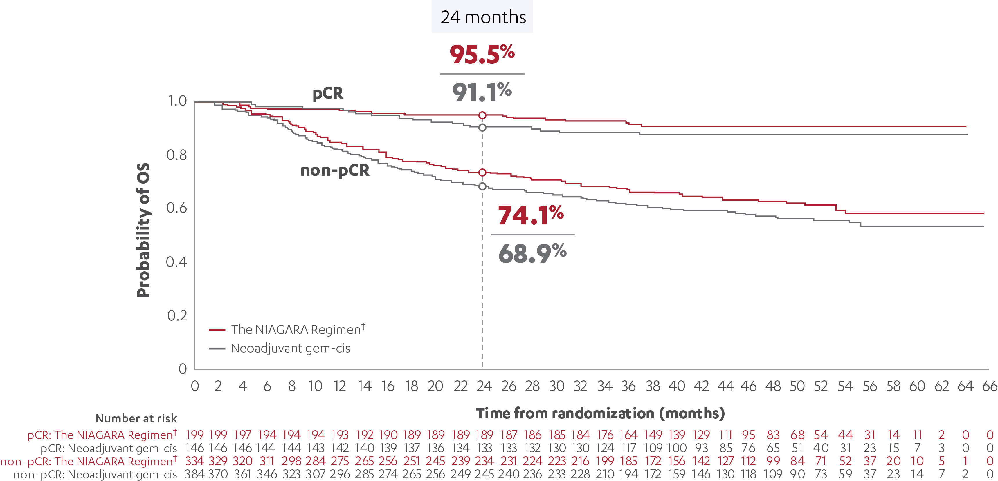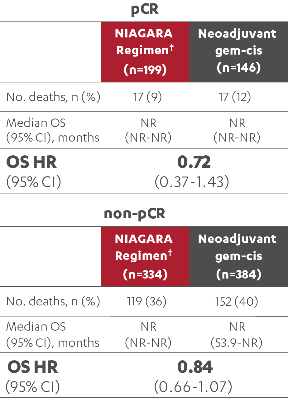 Median OS was not reached with the NIAGARA Regimen† (95% CI, NR-NR) nor with neoadjuvant gem-cis (95% CI, NR-NR)